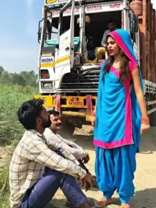 From the truck, a young Indian woman steps down naturally. She is wearing a blue color salwar kameez, simple and realistic, with natural hair and minimal makeup. She closes the truck door and walks confidently towards the boy.